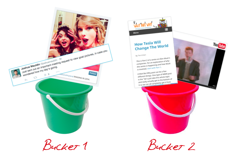 Rather, the dividing line between the two buckets is how fast the content can be consumed. If it can be consumed in let’s say ≤ 10 sec., throw it in Bucket 1. If > 10 sec., then it goes in Bucket 2.