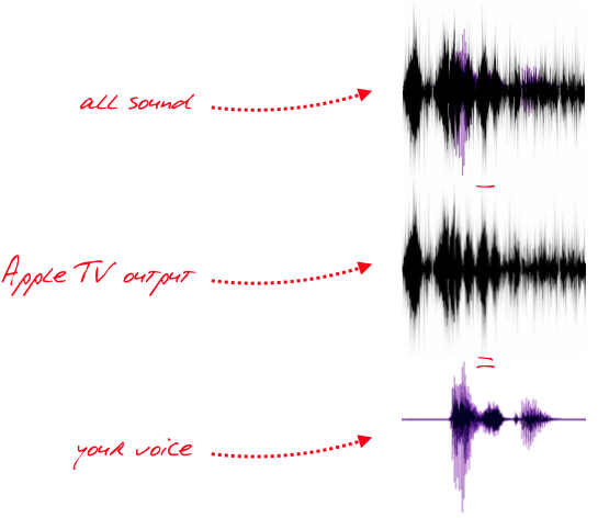 This could be remedied with some fancy footwork on the audio engineering side: If the audio is always being outputted from Apple TV itself (more on that below), the software could basically take the audio input from the microphone (sound from the speakers + your voice) and “subtract” the output signal (sound from the speakers only), leaving the delta (your voice only). That way it could “hear” you even over the loudest music or movie. It’s how certain noise canceling headphones work, and I don’t see why it couldn’t work here.